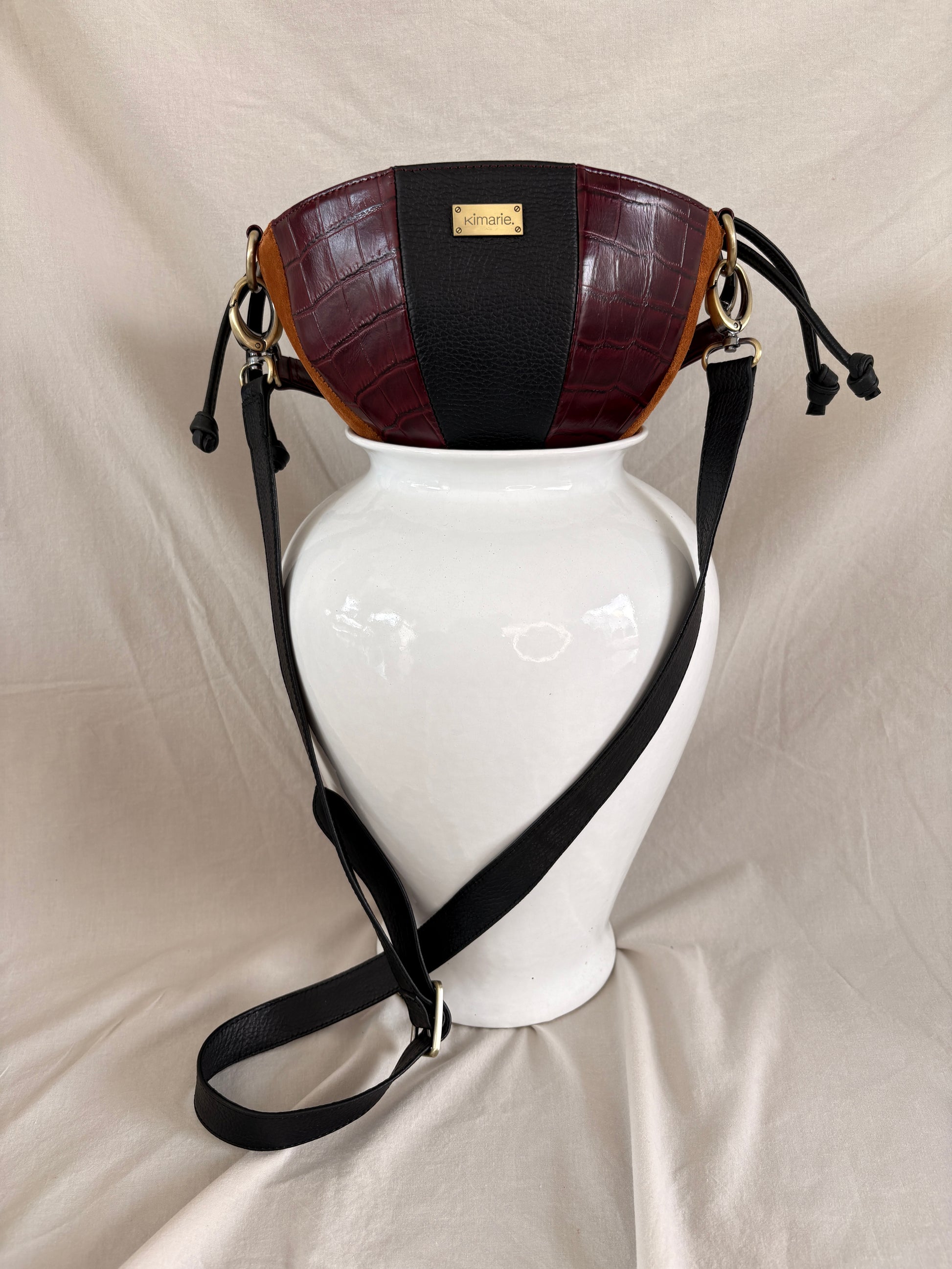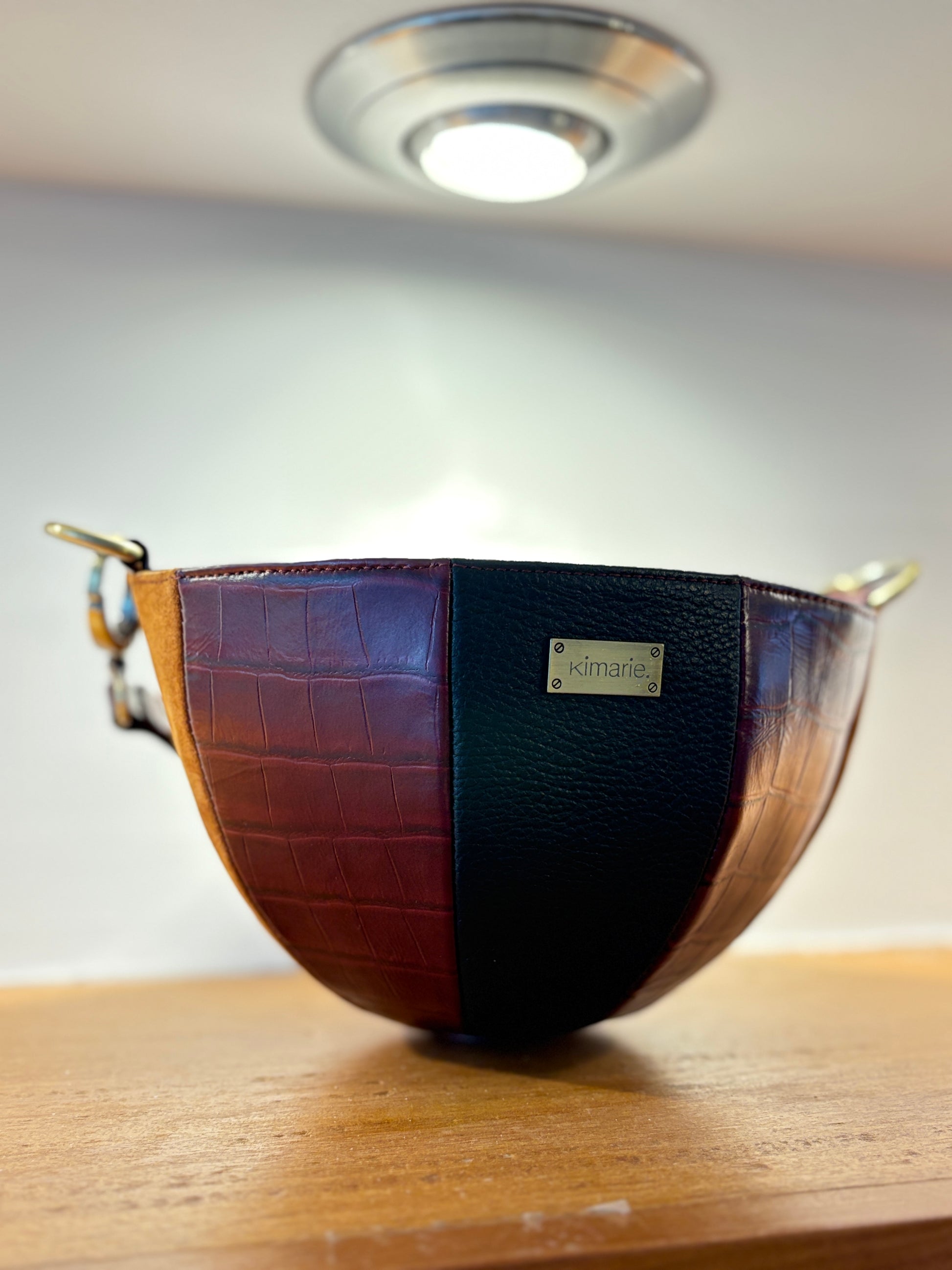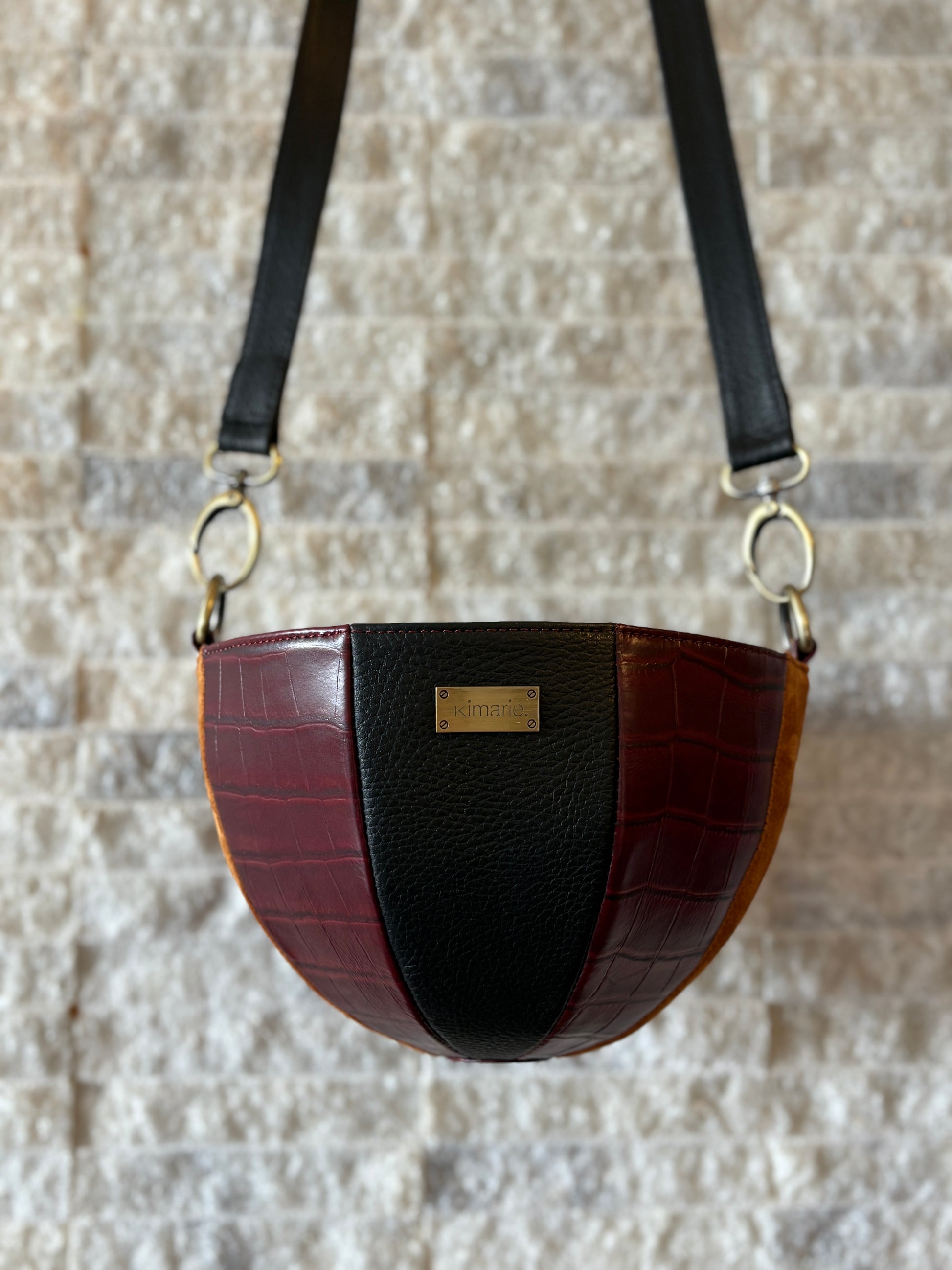 Cartera en tres cueros 100% vacuno: print croco, floater y gamuza, que se funden en un diseño redondeado, formando una silueta de bolita estructurada.